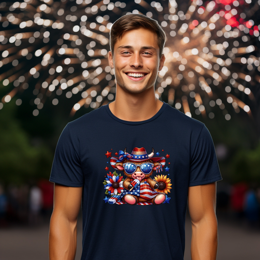 Patriotic Cow Shirt with Bandana and Firework | 4th of July Graphic Tee