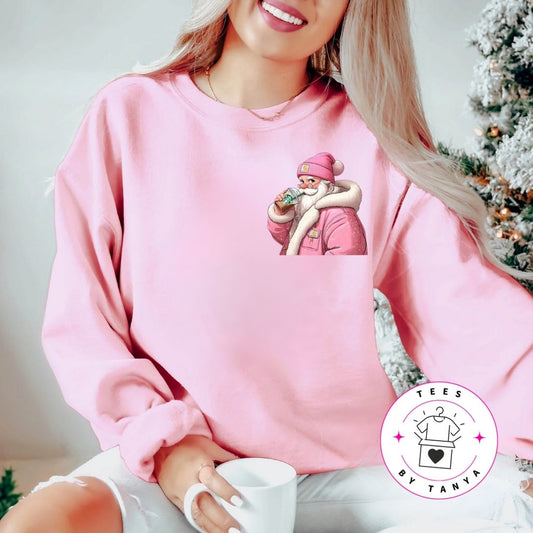 Pink Santa Drinking Coffee Shirt (Pocket Design)