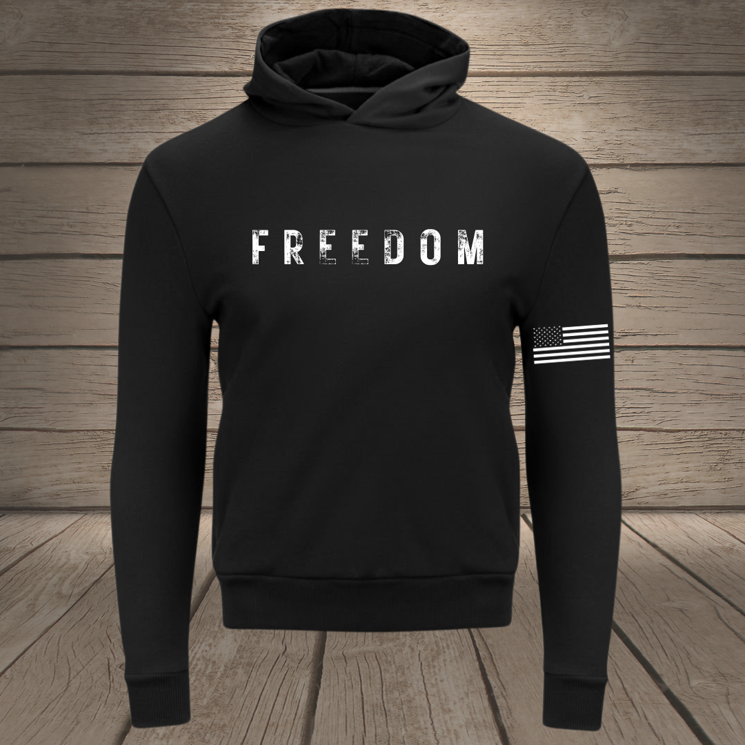 Show your American pride with this bold “FREEDOM” design printed on the chest and a classic US flag down the sleeve. Available in T-shirt, crewneck, or hoodie styles and in white, black, gray, or red. Perfect for everyday wear, patriotic holidays, or gifting to someone who loves to represent freedom in style.