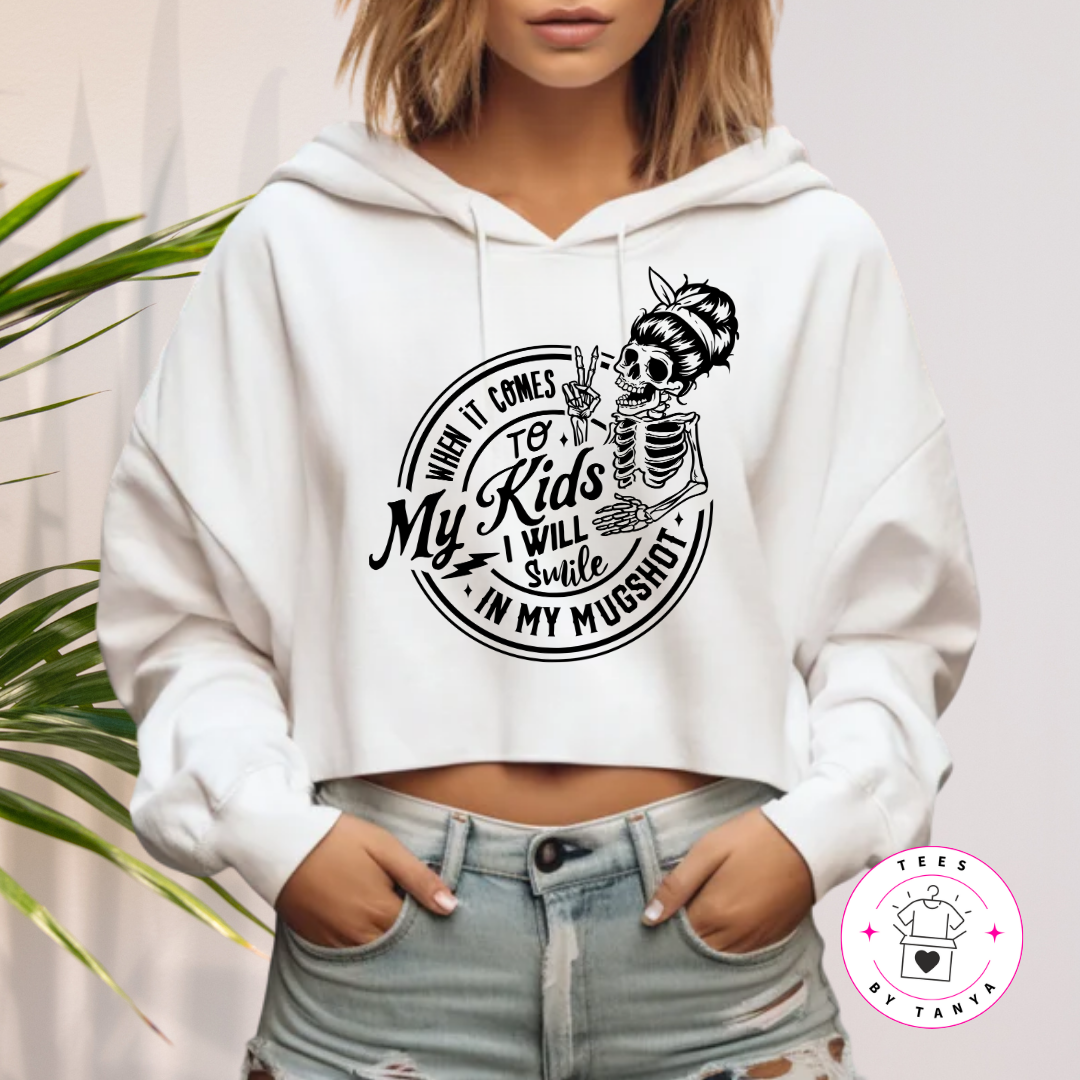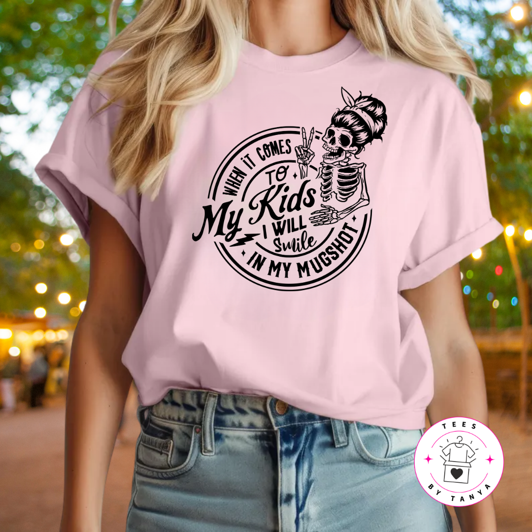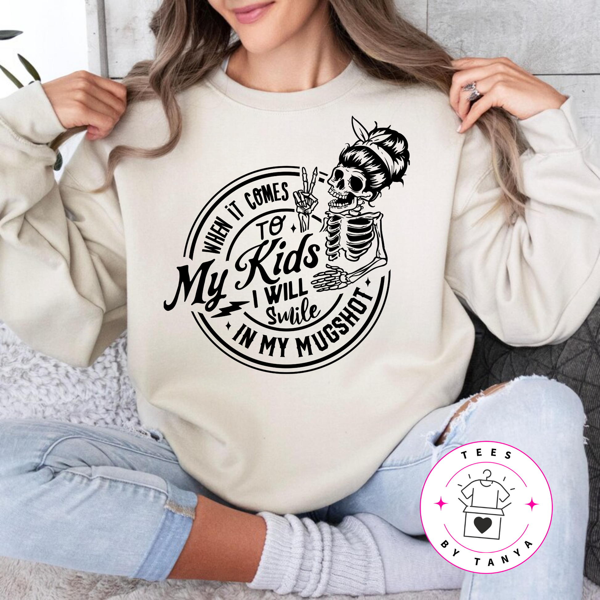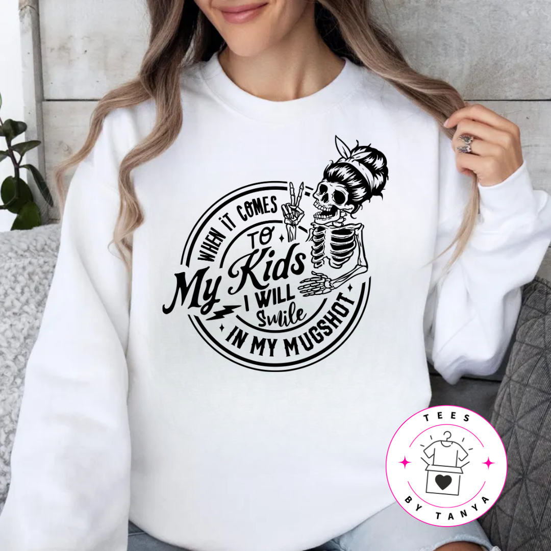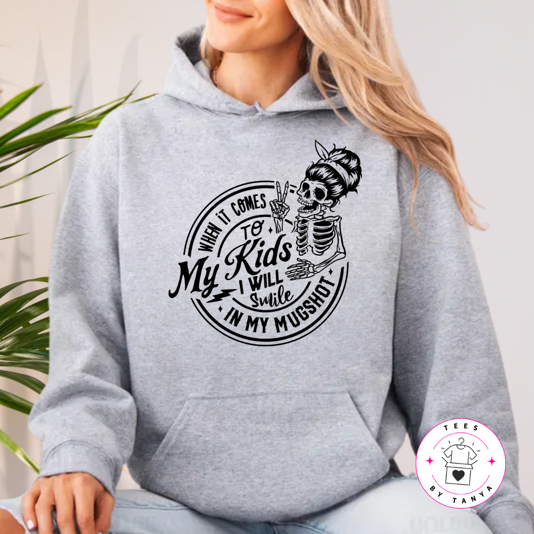 💪 Mom mode: Activated! If you’re the kind of parent who will do anything for your kids, this bold and funny design is for you! Featuring the phrase "When it comes to my kids, I will smile in my mugshot," this t-shirt, sweatshirt, or hoodie is perfect for moms who protect their little ones at all costs!