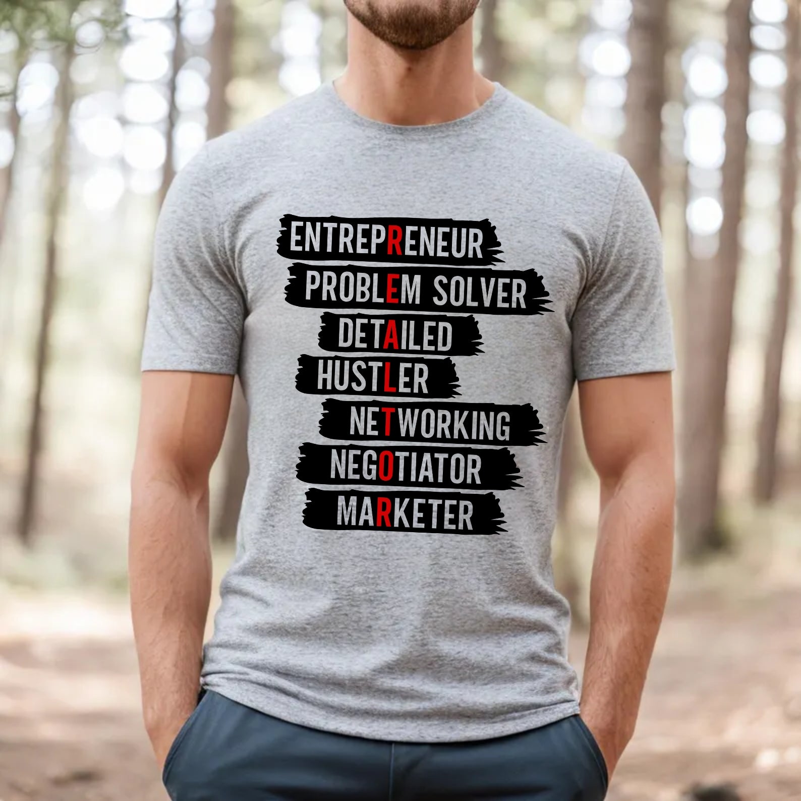 Celebrate the spirit of being a REALTOR with this unique and creative t-shirt, sweatshirt, or hoodie featuring the acronym: "ENTERPRENEUR PROBLEM SOLVER DETAILED HUSTLER NETWORKING NEGOTIATOR MARKETER"