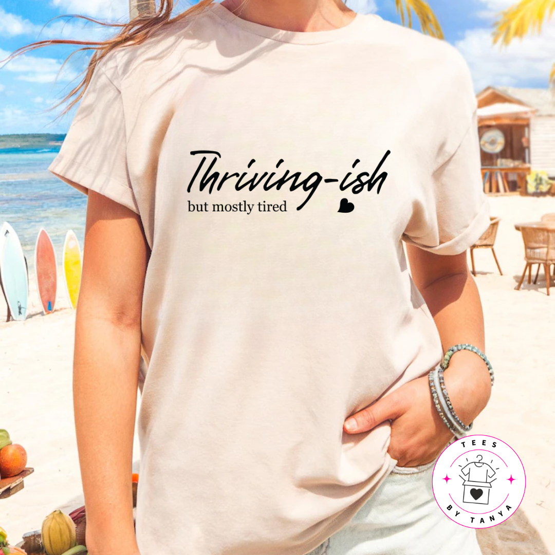 Get real with your journey and embrace the humor in being "Thriving-ish but mostly tired" with this comfy graphic tee, hoodie, or sweatshirt. A perfect choice for anyone who’s balancing life’s chaos with a healthy dose of sarcasm.