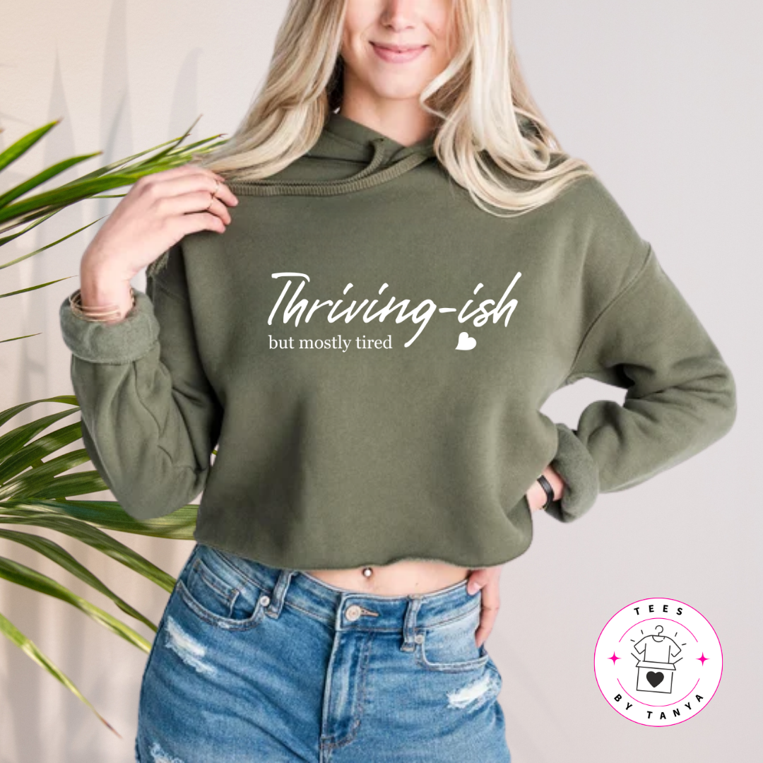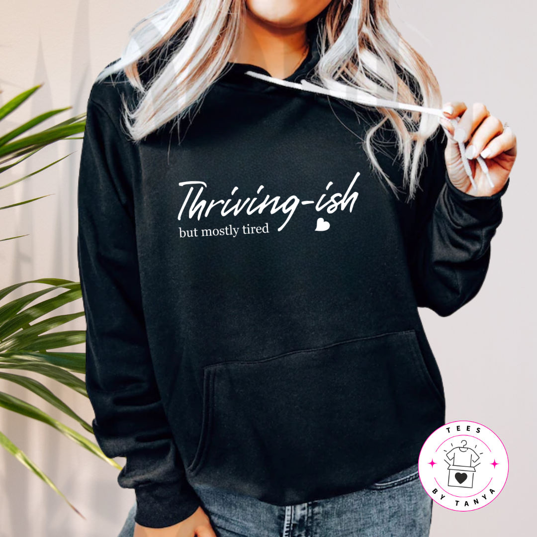 Thriving-ish But Mostly Tired Shirt | Funny Affirmation Tee, Sweatshirt or Hoodie for Adults | Relatable Humor Apparel